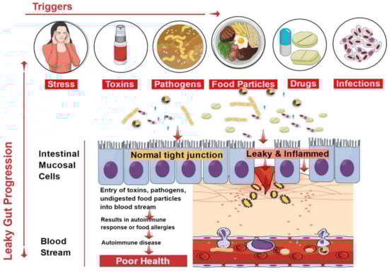 The vertebrate GI tract comprises an extraordinary chemical composition and a thick microbial atmosphere, which influence the immune reactions of host cells and excite a rich medium of effector mechanisms involved in innate and acquired immune responses. Any perturbations in the structural dynamics of the microbial community and their functions within the intestinal tract (referred to as dysbiosis) also become a cause of leaky gut condition and, ultimately, the occurrence of autoimmune diseases [14]. Microbial inhabitants of the GI tract are unique in shaping the host’s immunity and regulating metabolism [14]. Newly studied data specify a serious role of gut microbiota associated with autoimmune diseases [15,16]. Many Candida spp. on reaching the lining of the gastrointestinal wall cause collapse of the brush border epithelium lining the GI tract [17]. In addition, Salmonella sp., Giardia sp., Yersinia sp., Helicobacter pylori, Blastocystis hominids, Shigella sp., and other pathogenic microbes disrupt the intestinal lining, thereby causing gastrointestinal problems [18]. The digestive diseases or liver damage cases have amplified the propensity towards the leaky gut condition.