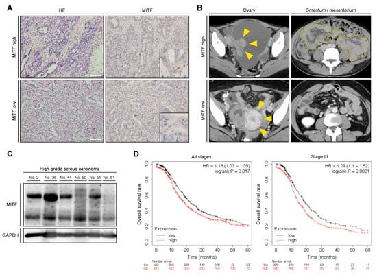 Clinical impact of microphthalmia-associated transcription factor (MITF) expression in ovarian cancer (OvCa) tissue. (A) Representative image of the H&E staining and immunohistochemistry of the MITF at a primary OvCa site. Scale bar: 100 μm. (B) Representative image of computed tomography in patients with high and low MITF expression in OvCa tissue. Arrowheads indicate the primary OvCa site and the enclosed area highlights peritonitis carcinomatosis. (C) Immunoblot analysis of the tissue samples extracted from primary OvCa. (D) Kaplan–Meier curves of progression-free survival in all patients and those with stage III OvCa, stratified by differences in MITF expression.