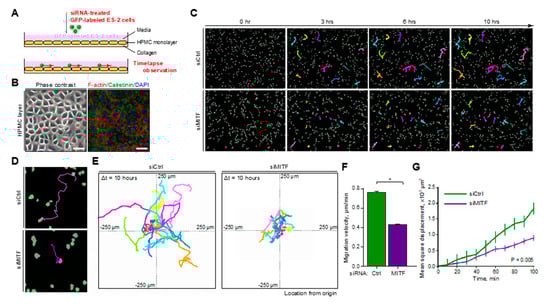 HPMCs were isolated, as we previously reported [], from the tumor-free human omentum of patients with malignant ovarian tumors. The HPMCs were cultured on collagen-coated plates in RPMI-1640 media supplemented with 10% FBS and penicillin/streptomycin until confluency. Confluent monolayers of HPMCs were incubated, and then GFP-labeled ES-2 cells with control or MITF-targeted siRNA were seeded. The time-lapse images were acquired every 10 min for 600 min with a BZX-800 microscope and then analyzed with BZX-800 View Analyzer Software. The average migration velocities and mean squared displacements (MSDs) of individual cancer cells were obtained.