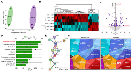 Proteomic analysis reveals the relationship between MITF and cancer pathways. (A) A principal component analysis (PCA) map illustrating similarities in altered protein expression between each sample group. (B) A heat map illustrating differentially expressed proteins in ES-2, NOE, and HEY cells treated with control or MITF-targeted siRNA. (C) A volcano plot indicating the fold changes in expression and p values for all proteins identified in ES-2 cells treated with control or MITF-targeted siRNA. (D) Pathway enrichment analysis and interactomes created with proteins related to cancer pathways. (F) Proteomaps depicting the fold changes and associated functions of altered proteins within OvCa cells treated with MITF-targeted siRNA compared to those treated with control siRNA.
