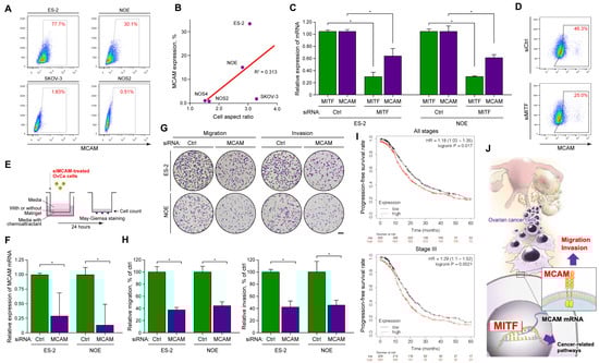 MCAM modulated by MITF promotes motility and invasion of OvCa cells. (A) Flow cytometry images demonstrating MCAM on OvCa cells. (B) Correlation between MCAM expression on flow cytometry and cell aspect ratios of OvCa cell lines. (C) Relative expression of MITF and MCAM mRNA in ES-2 and NOE cells treated with control or MITF-targeted siRNA. * p < 0.05 (t-test). (D) Flow cytometry images of MCAM on ES-2 cells treated with control or MITF-targeted siRNA. (E) Schematic protocol for the motility and invasion assay. (F) Relative expression of MCAM mRNA treated with control or MCAM-targeted siRNA. (G) Representative images from the motility and invasion assays. Scale bar: 200 μm. (H) Relative migration and invasion percentages of ES-2 and NOE cells under siRNA treatment. * p < 0.05 (t-test). (I) Kaplan–Meier curves of all patients and those with stage III OvCa, stratified by differences in MCAM expression. (J) Graphical abstract of the findings in this study.