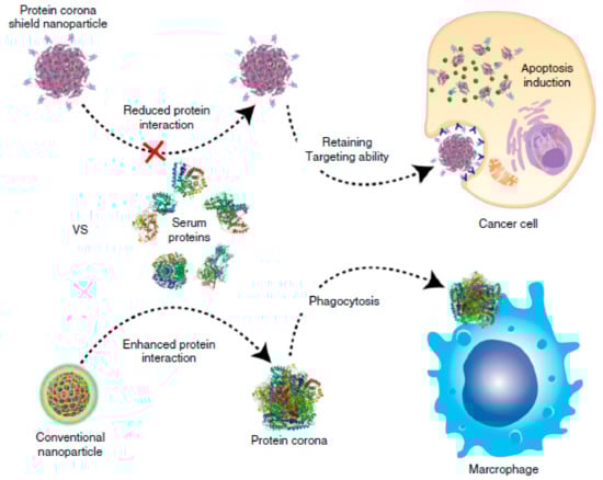 - Oh, J.Y.; Kim, H.S.; Palanikumar, L.; Go, E.M.; Jana, B.; Park, S.A.; Kim, H.Y.; Kim, K.; Seo, J.K.; Kwak, S.K.; et al. Cloaking nanoparticles with protein corona shield for targeted drug delivery. Nat. Commun. 2018, 9. [Google Scholar] [CrossRef]