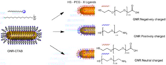 The antifouling properties of particles and surfaces have also been tuned by changing the chemical composition of PEG layers found around them. This includes the introduction of different terminal groups, but also the combination of PEG polymers with other kinds of antifouling covers. The most common chemical modification of the PEG layer of a particle or surface is the use of chains with different charges in their terminal groups. The interactions between such charged PEG layers and proteins would mainly have an electrostatic character. Therefore, although the use of PEG polymers would normally reduce protein binding, the final surface charge will alter the final size and binding strength of the protein corona. For example, in a recent study, gold nanorods were covered with 5 kDa PEG chains carrying a -COOH terminal, -NH2 terminal, or equal combination of PEGs carrying both terminal groups (Figure 3). The overall charges for these systems were negative, positive, or neutral (respectively), leading to nanorods with different binding affinities towards Bovine Serum Albumin (BSA), which exhibited the following trend: positively charged PEGylated-nanorods > negatively charged PEGylated-nanorods > neutral charged PEGylated-nanorods [41]. Likewise, a similar effect was observed when CdSe quantum dots (QDs) were coated with 0.6–1 kDa PEG chains containing -NH2, -COOH, or -OCH3 terminal groups, and their interaction with BSA protein was studied using agarose gel electrophoresis [42]. Again, the binding affinities of NPs with different surface charges towards proteins might be due to changes in hydrophobicity caused by the presence of charged ligands. Nevertheless, the inclusion of both positively and negatively charged ligands in the NPs led to an increase of the hydrophilicity of particles. Therefore, the preferential interaction of proteins with positively charged NPs cannot be directed by changes in hydrophobicity.