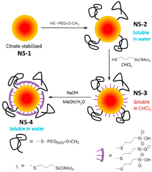Finally, PEG polymeric layers have been combined with a single monolayer of silica. Au NPs with a 15 nm diameter were coated with a monolayer of silica by depositing a layer of 3-mercaptopropyltrimethoxysilane monomer on their surface and then crosslinking them using an aqueous basic solution (Figure 4). The synthesis was made possible by pre-stabilizing the particles with a small amount of 5 kDa HS-PEG (0.8 chains/nm2). Pre-stabilization with the PEG was needed to allow deposition of the hydrophilic monomer. This permitted particles that combined the properties of PEG (a high aqueous stability, even at a low pH) and silica coatings (stability against cyanides, ligand exchange, and lyophilization, and easy functionalization of the shell) to be obtained. Furthermore, the particles presented much reduced protein coronas when compared with the PEG analogues [44].