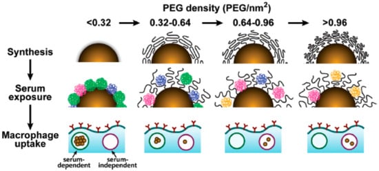 Cartoon showing the relation between the PEG density, protein corona, and macrophage uptake. Reprinted (adapted) with permission from reference [34]. Copyright (2012) American Chemical Society.