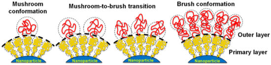 Nevertheless, the most important factor governing the adsorption of proteins by PEGylated particles or surfaces is the grafting density of the polymer. The density of PEG in a surface controls the topographical conformation adopted by the polymer chains, which can be described by three parameters: the Flory radius (RF) of the grafted PEG, the distance (D) between PEG grafts, and the thickness (L) of the PEG layer. The Flory radius is the radius of the volume occupied by an extended polymer, and is a constant for each type of polymer chain. RF can be calculated using the equation [RF = αN3/5] [29], where N is the number of monomers per chain (N) and α is the length of a single monomer (for PEG, α = 0.35 nm). Additionally, the PEG density can be converted to the area that one PEG chain occupies (A), and the distance between PEG graft sites (D) can be calculated using the equation [D = 2(A/π)1/2]. Finally, the thickness of the PEG layer can be obtained using different experimental methods (i.e., DLS, TEM, etc.). By knowing the value of the three parameters D, RF, and L, the conformation of the PEG chain can be distinguished [45].