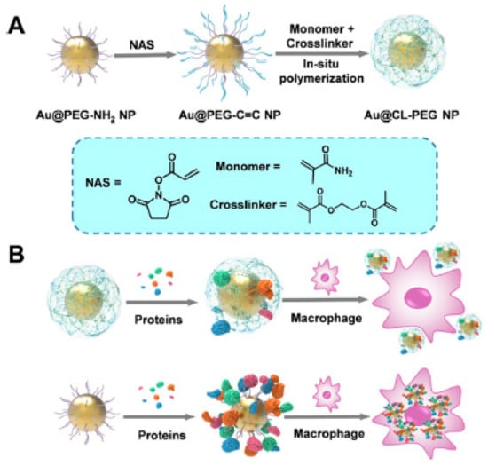 (A) Synthetic process leading to the generation of crosslinked PEG shells around Au nanoparticles, and (B) representation of the interaction between particles with crosslinked or linear PEG shells and proteins or macrophages. Reprinted with permission from reference [50]. Copyright (2019) American Chemical Society.