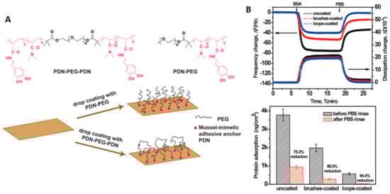 In addition to the success demonstrated by the crosslinking of the PEG shell, a few groups have recently started to look at the possibility of controlling protein adsorption in surfaces by altering the morphology or topology of the polymers used. For example, instead of normal brushes on the surface of materials, triblock polymers of the type ABA have been used to form polymeric brushes consisting of looped polymers. Normally, these polymers were attached to the surfaces using mussel bio-inspired 3, 4-dihydroxyphenyl-L-alanine (DOPA)-rich polymers on their ends (which can bind to the surfaces that they are grafted to). For example, surfaces treated with loop-forming tri-block copolymers carrying a double-length PEG (Figure 8) showed almost a 10 times reduction in the amount of HSA absorbed (31.7 ± 2.9 ng/cm2) when compared with surfaces treated with an analogue diblock copolymer (277.2 ± 32.4 ng/cm2). This reduction in the adsorption of HSA was more than 30 times lower than when compared with uncoated surfaces (937.2 ± 82.3 ng/cm2). Remarkably, both PEG coatings adopted the brush regime, and the graft density of the loop-forming triblock was half that of the brush-forming diblock, meaning that they had the same end graft density. Therefore, the antifouling differences were mostly due to strong steric hindrance of the neutrally charged polymer loops compared to the brush [51].