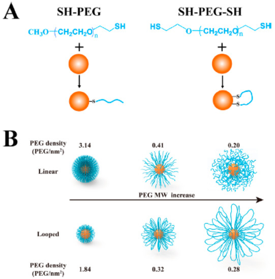 Au nanoparticles carrying linear or loop PEG shells. (A) Structure of linear and loop PEG ligands and binding over Au nanoparticle surface. (B) Au nanoparticles with linear (top) or loop (bottom) PEGs of different sizes (1, 5, or 10 kDa; from left to right) representing changes in the graft density and hydrodynamic radii of the different polymeric shells. Reprinted with permission from reference [52]. Copyright (2019) American Chemical Society.