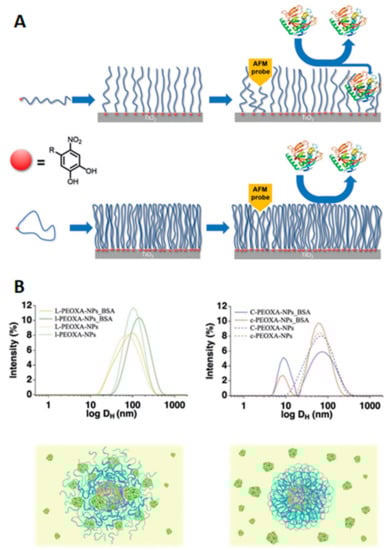 Antifouling cyclic poly-2-ethyl-2-oxazoline (PEOXA) and its effect on protein adsorption. (A) surfaces coated with linear (top) or cyclic (bottom) polymers and representation of their interaction with proteins. Reprinted with permission from reference [53]. Copyright (2017) Wiley. (B) DLS traces and schematic representation showing the interaction of BSA with nanoparticles coated with linear (left) or cyclic (right) polymers. Reprinted with permission from reference [57]. Copyright (2017) Wiley.