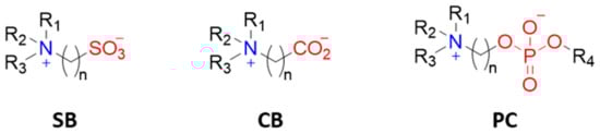 Most commonly used zwitterionic moieties: sulfobetaine (SB), carboxybetaine (CB), and phophorylcholine (PC).