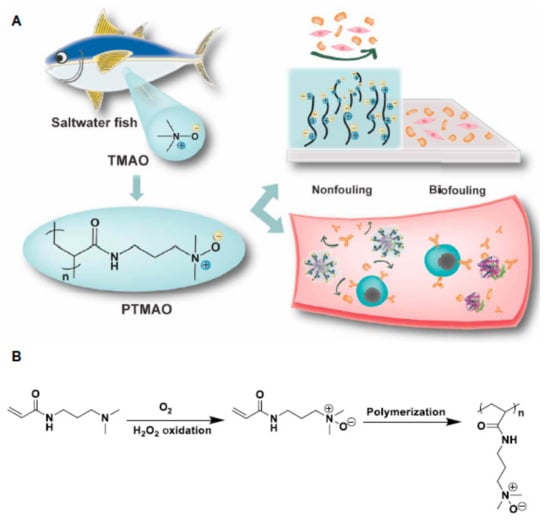 (A) Schematic representation of trimethylamine N-oxide (TMAO)-based polymer (PTMAO) anti-biofouling properties when forming hydrogels and (B) its synthesis. Reprinted with permission from reference [60]. Copyright (2019) American Association for the Advancement of Science.