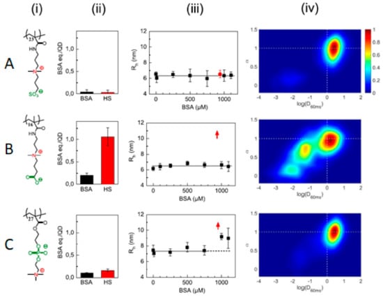 (A) Sulfobetaine (SB)-, (B) carboxybetaine (CB)-, and (C) phosphorycholine (PC)-based polymers (i) and their interactions with BSA and human serum (HS), as probed by a fluorescamine test (ii), size analysis by fluorescence correlation spectroscopy (FCS) (iii), and mobility profiles in the cytosol (iv). Reprinted with permission from reference [58]. Copyright (2019) Elsevier.