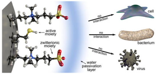 Although zwitterions are effective in avoiding the protein corona and increasing circulation times, they do not have an active targeting capacity towards proteins or membrane receptors. Therefore, the combination of zwitterions with biologically active functionalities for active targeting is highly desirable in the field of nanomedicine, but remains a challenge. It is possible to introduce a secondary functionality, such as amino, carboxyl, or thiol moieties, while maintaining the non-fouling properties of zwitterionic NPs, as long as the zwitterionic groups protrude from the surface by using shorter linker chains for the second functional groups. With such a design, the protective hydration layer typical of zwitterionic materials is maintained, as are the antifouling and stealth features. This was tested with silica NPs and no differences in protein corona formation and the hemolytic capacity were detected between only zwitterionic and doubly-functionalized NPs (with zwitterions and an additional functional group selected from amino, mercapto, or carboxyl groups). Unfortunately, the water molecules attached to the zwitterions actually shielded the secondary functionalities, which were not available for interaction with biomolecules or membranes and were virtually invisible and hence not functional (Figure 14) [65].