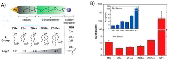 (A) Structure of the ligands and zwitterionic/hydrophobic moieties employed. (B) Cellular uptake of NPs functionalized with each type of zwitterion in the presence (red) and absence (blue) of serum. Reprinted (adapted) with permission from reference [70]. Copyright (2014) American Chemical Society.
