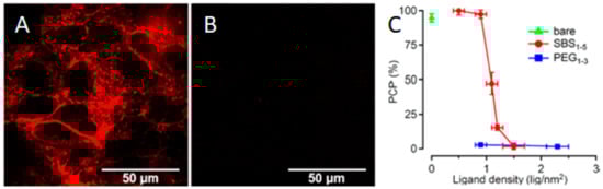 Fluorescence confocal microscopy images of zwitterion-functionalized quantum dots (QDs) (A) versus PEGylated QDs (B) and the correlation between a positive cell percentage (PCP) and ligand type and density (C). Reprinted with permission from reference [72]. Copyright (2019) American Chemical Society.