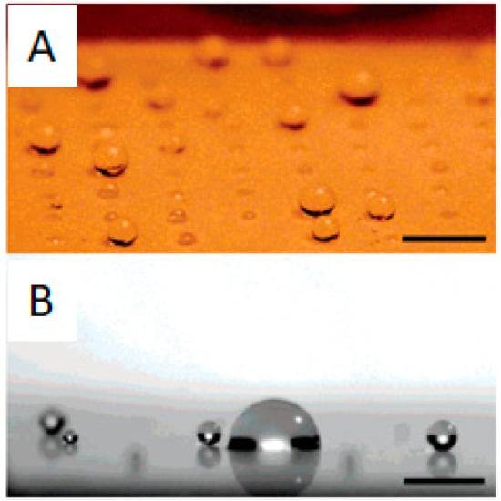 (A) Water droplets with different contact angles on a patterned surface with superhydrophobic patches. (B) Accumulation of sprayed water droplets on hydrophilic patches on a mixed hydrophilic/superhydrophobic patterned surface. Reprinted with permission from reference [77]. Copyright (2006) American Chemical Society.