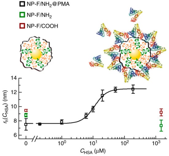 Study of size changes due to Human Serum Albumin (HSA) protein corona formation on fluorinated nanoparticles (NPs) with amino groups (green), carboxyl groups (red), and coated with polycarboxylated polymer (black). Reprinted with permission from reference [9]. Copyright (2017) Springer Nature.