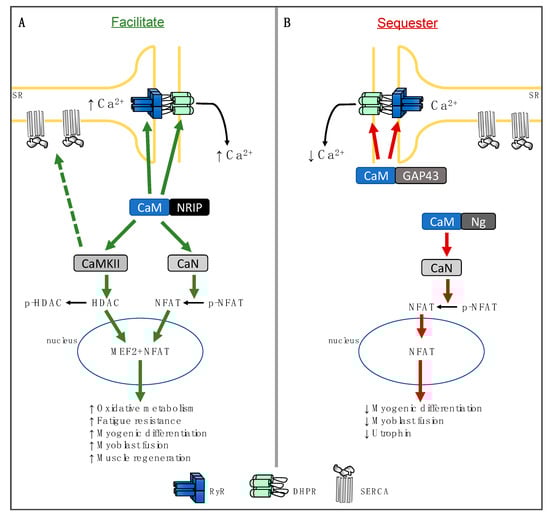 By uncovering the role of these endogenously expressed proteins that either facilitate CaM binding with its downstream targets (NRIP, Figure 1A) or sequester it away from its downstream targets (Ng and GAP43, Figure 1B), a new area of research has emerged in the field of muscle physiology. With the abundance of experimental support demonstrating the physiological importance of CaM-dependent and CaM-regulated proteins (i.e., CaN, CaMKII, RyR, and DHPR) in muscle, we can anticipate that these CaM-binding proteins, and those yet to be uncovered and characterized, could have several physiological implications.