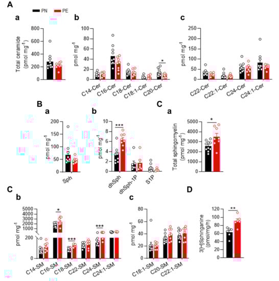 Interestingly, sphingosine and S1P, downstream products of ceramide, also presented a decreasing trend in PE arteries versus control patients, although this was not significant (Figure 1B(a),(b)). Notably, the level of dihydrosphingosine (dhSph), a downstream product of serine palmitoyltransferase (SPT), the first and rate limiting enzyme of the de novo biosynthesis, was significantly augmented in chorionic arteries of preeclamptic women (Figure 1B(b)), suggesting an upregulation of this pathway. The dhSph levels have been reported to be associated with cardiovascular disease [22]. Accordingly, PE was accompanied by an accrual of total SM levels (Figure 1C(a)). The analysis of the single SM species revealed a significantly higher content of C16:0-, C18:0-, and C24:0-cer in PE arteries compared to PN (Figure 1C(b)). These data collectively suggest that during PE, the sphingolipid metabolism of the feto-placental vasculature is shifted towards SM, by altered production/catabolism.