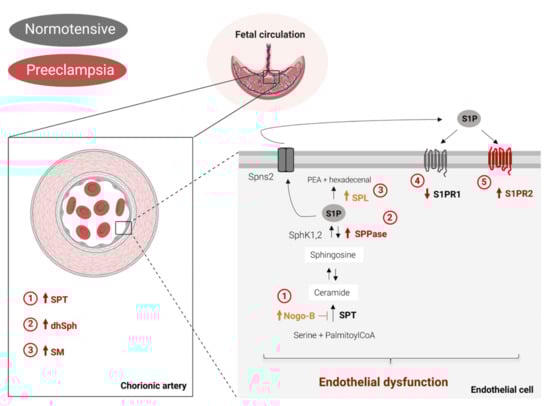 To our knowledge, this is the first study describing how PE affects sphingolipid metabolism at the feto-placental vasculature. Our study reveals a distinct alteration of the sphingolipid profile during preeclampsia, which includes (Figure 3): increased de novo biosynthesis, accumulation of dhSph, and augmented production of SM in chorionic arteries. In PE endothelial cells, the increased expression of Nogo-B, SPPase, and S1P lyase, together with the decreased S1PR1 expression and concomitant S1PR2 upregulation, indicate the onset of an endothelial dysfunction, typical of this disorder. In the present study, all the experiments were carried out exclusively on human tissues, which is the strength of our work. One limitation of our study is the small cohort. However, we believe that our study paves the way for future research on the role of sphingolipids in the pathogenesis of preeclampsia.
