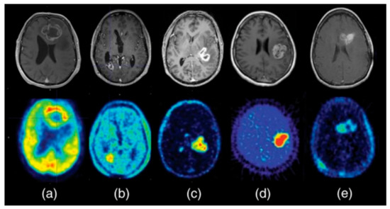 Contrast-enhanced Magnetic Resonance Imaging (MRI) (top row) and multiple PET tracers for diagnostic imaging (bottom row) in glioblastoma. (a) [18F]-2-fluoro-2-deoxy-D-glucose ([18F]FDG), (b) O-(2-[18F]-fluoroethyl)-L-tyrosine ([18F]FET), (c) [18F]Fluorocholine, (d) 1-(2-Nitro-imidazolyl)-3-[18F]fluoro-2-propanol ([18F]FMISO), (e) 3′-deoxy-3′-[18F]fluorothymidine ([18F]FLT). Adapted from [24]. This research was originally published in Glioblastoma [internet]. Bolcaen, J.; Acou, M.; Descamps, B.; Kersemans, K.; Deblaere, K.; Vanhove, C.; Goethals, I. PET for therapy response assessment in glioblastoma. In Glioblastoma [Internet]; De Vleeschouwer, S., Ed.; Codon Publications: Brisbane, AU, 2017.
