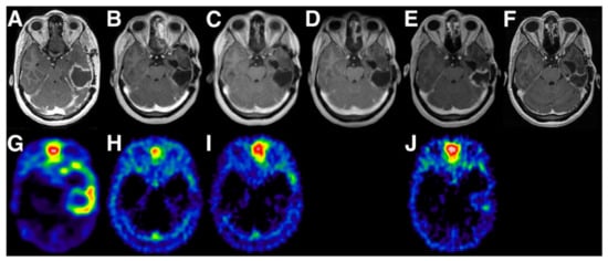 - Schwarzenberg, J.; Czernin, J.; Cloughesy, T.F.; Ellingson, B.M.; Pope, W.B.; Grogan, T.; Elashoff, D.; Geist, C.; Silverman, D.H.; Phelps, M.E.; et al. Treatment response evaluation using 18F-FDOPA PET in patients with recurrent malignant glioma on bevacizumab therapy. Clin. Cancer Res. 2014, 20, 3550–3559. [Google Scholar] [CrossRef] [PubMed]