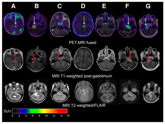 MRI and PET-MRI fusion images of patients with diffuse midline glioma (DMG). (A–G) Top row: [89Zr]Zr-bevacizumab PET (144 hrs post-injection) fused with T1-Gadolinium (Gd) weighted MRI per patient; middle row: T1-Gd weighted MRI; lower row: T2-weighted/Fluid-attenuated inversion recovery (FLAIR) MR-images. Five tumors show a variable uptake of [89Zr]Zr-bevacizumab (white arrows), with both PET negative and positive areas within each tumor. Two primary tumors are completely PET negative (C and E), while the T2 weighted images show tumor infiltration in the whole pons of both patients. In the middle row, the red arrows represent the areas of contrast enhancement within the tumor. In four out of five primary tumors, the PET-positive area corresponds with the contrast-enhancing area on MRI of the tumors (A,B,F and G). In C, the tumor shows an MRI contrast-enhancing area, while there is no 89Zr-bevacizumab uptake. Figure D shows a PET-positive tumor, while no Gd-enhancement is observed on MRI. Adapted from [137]. This research was originally published in JNM. Jansen MH, Veldhuijzen van Zanten SEM, van Vuurden DG, Huisman MC, Vugts DJ, Hoekstra OS, et al. Molecular Drug Imaging: (89)Zr-Bevacizumab PET in Children with Diffuse Intrinsic Pontine Glioma. J Nucl Med. 2017;58(5):711-6. © SNMMI.