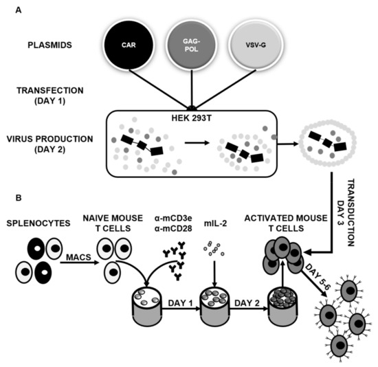 Genetic modification of mouse T cells with chimeric antigen receptors: (A) Scheme of retrovirus production. (B) Scheme of mouse T cell separation and activation.