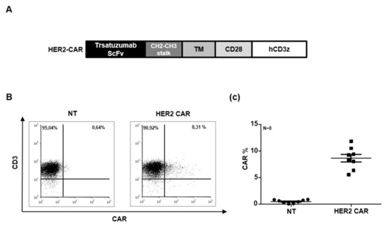 The CAR contains an scFv obtained from trastuzumab, an IgG1 CH2-CH3 extracellular stalk, a CD28 costimulatory endodomain and a CD3z effector domain (Figure 2A). Using trastuzumab as a recognition domain allowed us to compare the impact of CAR T cells as living drugs with the impact of antibodies. The mean transduction efficiency was 8.7% (range: 5.58–11.84%; n = 8) as judged by flow cytometric analysis of the HER2 specific scFv (Figure 2B,C). We confirmed that CARs are stably expressed and re-confirmed CAR expression on day 10.