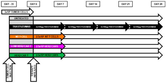 Outline of in vivo animal treatment schedule: Mice were s.c. injected with 3 × 106 JIMT-1 cells. 35 days later (on day 0), mice received 100 µL PBS buffer twice weekly (untreated, n = 5), 100 µg trastuzumab in 100 µL PBS buffer twice weekly (trastuzumab, n = 5), or an i.v. dose of 2.5 × 105 HER2 CAR mouse T cells (low-dose HER2 CAR, n = 5), or an i.v. dose of 2.5 × 106 HER2 CAR mouse T cells (HER2 CAR, n = 5). Tumor growth was followed by caliper and was derived as the product of the length, width and height.