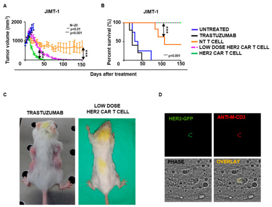 Antitumor activity of HER2-CAR mouse T cells in a xenograft model: (A) Quantitative measurement of tumor volumes (volume = mm3; low dose HER2-CAR versus HER2-CAR groups: *** p < 0.001; NT T cell versus HER2-CAR groups *** p < 0.001). (B) Kaplan-Meier survival curve (NT T cell versus both HER2 CAR groups *** p < 0.001). (C) Representative images of animals. (D) Representative images for the detection of HER2-CAR mouse T cells in JIMT-1 xenografts (field of view: 92 μm × 92 μm). HER2-CAR mouse T cells were visualized by AlexaFluor647 conjugated anti-mouse CD3e and HER2-GFP co-staining.