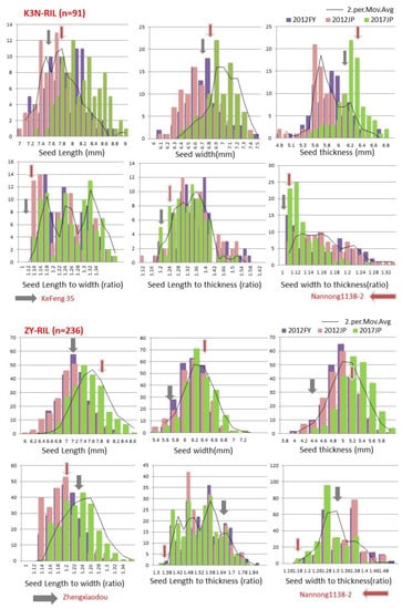 Frequency distribution of seed length (SL), seed width (SW), seed thickness (ST), seed length-to-width (SLW), seed length-to-thickness (SLT), and seed width-to-thickness (SWT) in ZY and K3N recombinant inbred line (RIL) populations across three different environments (2012FY, 2012JP, and 2017JP). Trend lines show the moving average. Arrows represent mean value of corresponding parent. Horizontal and vertical axis represent trait value and number of genotypes, respectively.