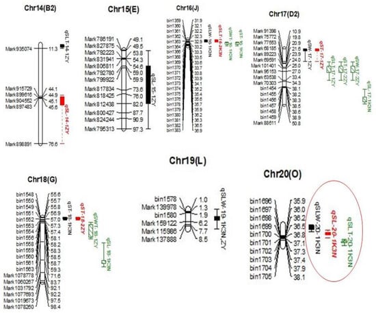 QTL mapping is a practical approach and has been frequently employed for the detection of QTLs/genes underlying the quantitative traits in crop plants. However, the efficiency and accuracy of QTL mappings are influenced, mainly by parental diversity and marker density []. The quality of genetic maps has a significant impact on the accuracy of QTL detection, and, consequently, increasing marker density can intensify the resolution of QTL mapping []. Hence, it is a prerequisite to utilize high-density linkage maps for improving the efficiency and accuracy of linkage mapping and MAS. In this study, high-density genetic maps of ZY and K3N populations were used, consisting of 3255 SLAF and 1733 bin markers, respectively. The markers in both linkage maps, viz., ZY and K3N, were integrated to all 20 LGs and covered the total length of 2144.85 and 2362.44 cM, respectively, with an average distance between adjacent markers of 0.66 cM and 1.36 cM, respectively.