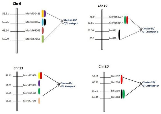 Diagram showing the physical location of four QTL clusters/hotspot regions (cluster-06, cluster-10, cluster-13, and cluster-20) on four different chromosomes viz., Chr6, Chr10, Chr13, and Chr20 identified in two RIL populations across multiple environments Different colors indicate different QTLs within same region.