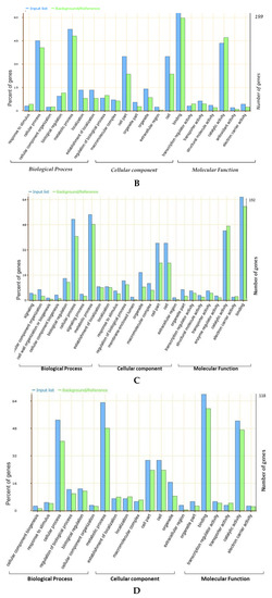 agriGO annotation information. (A) Cluster-06 (QTL Hotspot A), (B) Cluster-10 (QTL Hotspot B), (C) Cluster-13 (QTL Hotspot C), and (D) Cluster-20 (QTL Hotspot D).