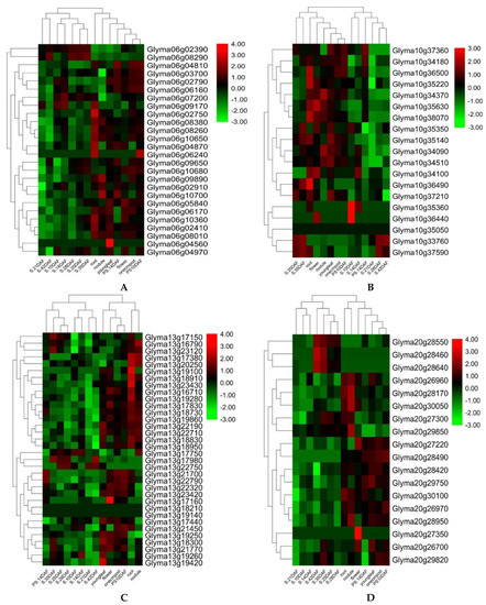 Heat map exhibiting the expression profiles of 23 candidate genes among the different soybean tissues and development stages from four QTL hotspots/clusters. (A) Cluster-06 (QTL Hotspot A), (B) Cluster-10 (QTL Hotspot B), (C) Cluster-13 (QTL Hotspot C), and (D) Cluster-20 (QTL Hotspot D). Heat map was generated using the RNA-sequencing data downloaded from online dataset SoyBase. Youngleaf—young leaf, Onecmpod—1 cm of pod, PS—pod shell, DAF—days after flowering, and S—seed.