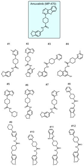 Amuvatinib (MP-470) was purchased from A2S (A4237-5, Saint Jean d’Illac, France). Compounds 1–7 were synthesized by chem-space.com (Riga, Latvia). Compounds 8–12 were synthesized by enamine.net (Riga, Latvia).