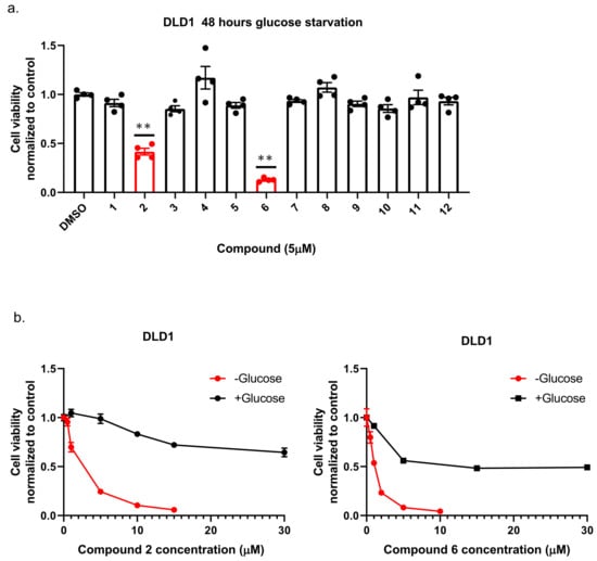 The selective toxicity of 12 amuvatinib derivatives under glucose starvation. (a) Bar graph showing relative cell viability of DLD1 tumor cell line treated with 5 µM of compounds 1–12 for 48 h under glucose starvation was determined using Crystal Violet staining. Cell viability is relative to the control group (equal volume of dimethyl sulfoxide (DMSO)). Bars of compounds 2 and 6 are colored in red. ** p < 0.0001. (b) Kill curves of compounds 2 and 6 with and without glucose. Relative cell viability was measured using Crystal Violet after 48 h with and without glucose.