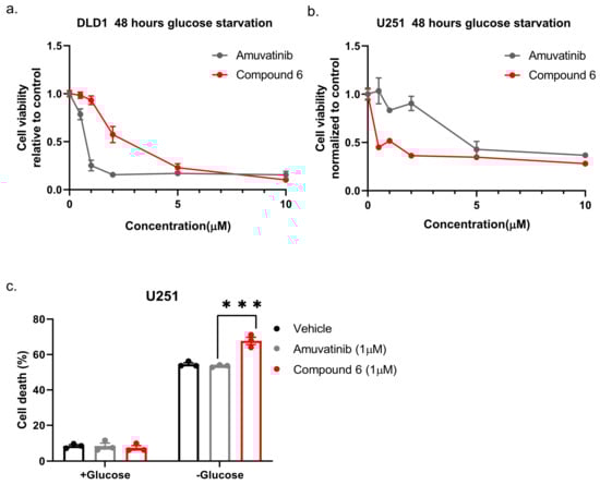 Comparing the potency of compound 6 to amuvatinib. (a) Cell viability of DLD1 or U251 (right) treated with the indicated compounds for 48 h: amuvatinib (gray line) or compound 6 (red line). (b) Cell death of U251 Cells treated with the indicated compounds for 16 h in glucose-starved medium. (c) Cell death was measured by propidium iodide (PI) staining and fluorescence-activated cell sorting (FACS). Cells were treated with 1 µM of either Amuvatinib (grey bars) or compound 6 (red bars). Vehicle (black bars): the same volume of DMSO as in the highest concentration of compound 6. *** p < 0.0001.