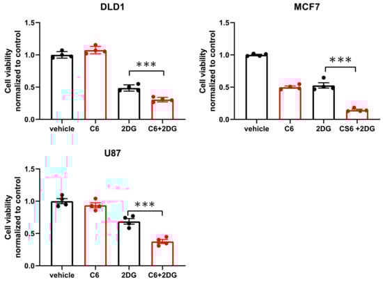Compound 6 is toxic under glycolysis inhibition. Relative cell viability of the indicated cell lines treated for 24 h with: vehicle (the same volume of DMSO as in the highest concentration of compound 6 with glucose) and 5 µM of compound 6 (C6), 2DG (25 mM), alone or in combination. Cell viability was measured using Crystal Violet staining. Results are normalized to control (vehicle). *** p < 0.0001.