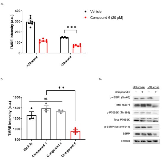 Our previous study showed that compounds exhibiting selective toxicity upon glucose starvation have two features: they inhibit the mTOR pathway upon glucose starvation; and they inhibit mitochondrial membrane potential independently of glucose starvation [13]. To test if compound 6 exhibits these features, we treated DLD1 cells with glucose-free or normal media and 20 µM compound 6 or vehicle for three hours, after which we measured mitochondrial membrane potential, using tetramethylrhodamine, ethyl ester (TMRE) and FACS (Figure 5a). Compound 6 significantly reduced mitochondrial membrane potential in glucose proficient or deficient conditions, suggesting that compound 6 is a mitochondrial toxin. To further validate this conclusion, we treated U251 cells with compounds #1 or #4 that are not toxic under glucose starvation, or compound 6, for 3 h, after which we measured mitochondrial membrane potential using TMRE and FACS (Figure 5b). In agreement with our model, only compound 6 significantly reduced mitochondrial membrane potential.