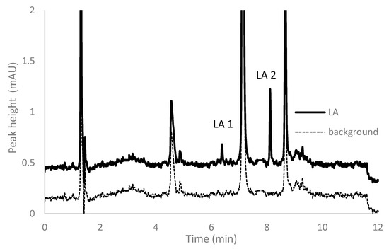 LA possesses structural similarity to medium chain fatty acids, e.g., octanoic acid; for this reason, it is preferably bounded by sit II in HSA [36,37]. For an accurate separation of free LA, removal of the analyte from plasma proteins is essential to prevent underestimation. For removal of free LA from proteins, a different method based on liquid–liquid extraction [25,26,27,38], solid phase extraction [39], and deproteinization [26,38] was elaborated. For liquid–liquid extraction of LA from plasma samples, dichloromethane, diethyl ether, and ethyl acetate were considered. Results provided by other investigators indicated that the recovery of extraction of LA form proteins with the use of an acidic mixture of MeCN is 98% [21]. In our protocol to release free LA from proteins and to avoid an additional step of extraction and protein precipitation, 20 µL of acetonitrile and 1 mol L−1 HCl were added to the final mixture after derivatization. The addition of HCl was necessary to stop the simultaneous reduction and derivatization reactions, and improve the stability of the derivatives. The addition of MeCN is necessary to remove the LA–BCPB derivative from the protein surface.