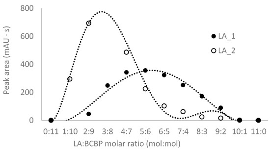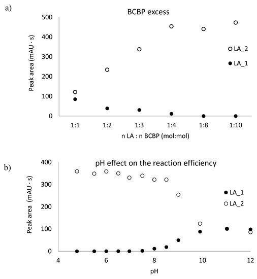 To continue studies on the proper parameters of LA and low-molecular-mass amino thiols, derivatization with BCPB was chosen. This compound reacts specifically with thiols via the –SH group to form stable 2-S-pyridinium derivatives with well-defined maximum absorption in the UV region (at 274 nm for the reagent and 321 nm for the derivative) and can be used in a wide range of pH [31,35]. In order to establish optimum conditions for the derivatization of LA and thiols, the pH of the buffer, the excess of BCPB, and time of derivatization reaction were tested. To estimate the stoichiometric molar ratio of the reagents, the continuous variation method for the reaction of LA with BCPB was applied. The derivatization reaction was carried out in 0.2 mol L−1 phosphate buffer, pH 6.0, and pH 9.0. The tests confirmed the presence of two different forms of LA derivatives and proved that these substrates react in the molar ratio of 1:1 (LA 1) and 1:2 (LA 2) (Figure 3). A similar relationship has not been mentioned in previously published studies. Additionally, we confirmed that the excess of BCPB (Figure 4a) and pH of the reaction mixture (Figure 4b) affect the derivatization efficiency and favor the reaction in which both –SH groups in the DHLA structure are blocked by BCPB. The high excess of the reagent positively affected the derivatization of all analytes of interest (Figure 4c). A complete derivatization reaction occurred after 10 min at pH 7.8 (Figure 4d).
