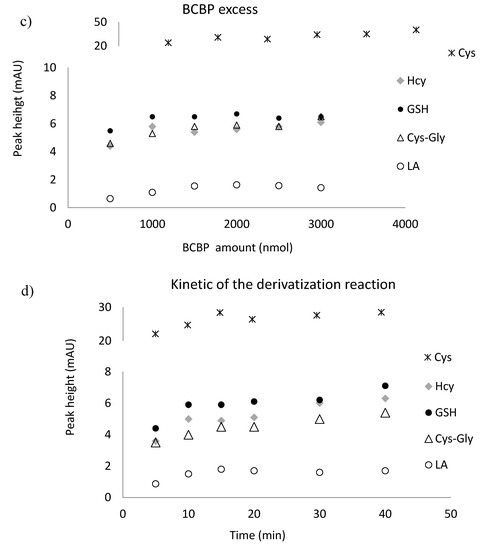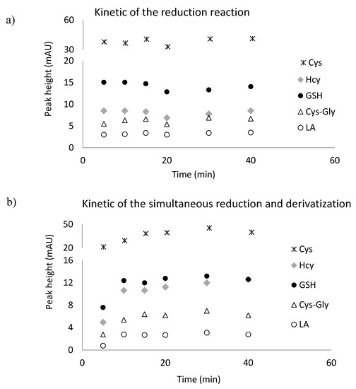 LA and GSH, Cys, Hcy occur in the human body, mainly in the oxidative form. To release the thiol groups and make them available for the derivatizing reagent, the reduction reaction is required. For this purpose tris(2-carboxyethyl)phosphine (TCEP) solution was used. This reagent is known to be powerful also under mild conditions of pH and temperature [28,31,33]. In our approach, disulfide bonds were reduced in 10 min at room temperature at pH 7.8 (Figure 5a).