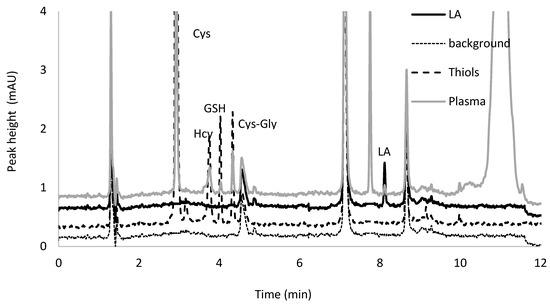 The high separation capacity of high performance liquid chromatography (HPLC) makes it the preferred technique for biological samples analysis. For quantification of LA in biological fluids, mainly in human plasma, several HPLC methods which exploit spectrophotometric [21], spectrofluorometric [22,23,24], electrochemical [25,26], and mass spectrometry [27] detection have been developed and described in the literature. Although these assays allow quantification of LA in human plasma, they do not give the possibility to control levels of metabolically important endogenous amino thiols such as GSH, Cys, Hcy, and Cys-Gly. Assays based on UV detection and HPLC or capillary electrophoresis analysis dedicated to low-molecular-mass thiols detection and determination have been summarized by Bald and co-authors [28].