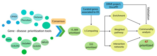 The use of prioritization strategies, through computational tools that use multiple heterogeneous data sources, allows for the improvement in gene detection related to complex traits or specific clinical phenotypes [13,14]. In addition, applying the functional enrichment analysis has proven to be a very efficient approach in gene prioritization because it describes important metabolic interactions that aid in explaining the pathogenesis of a given disease [15,16]. Thus, we used several bioinformatics tools in order to prioritize genes that describe oncological signaling pathways for OS and also applied a consensus strategy with the aim to specify and postulate new pathogenic mechanisms that explain the onset and development of this sarcoma. In Figure 1, we summarize the general workflow to prioritize genes associated with the pathogenesis of OS.