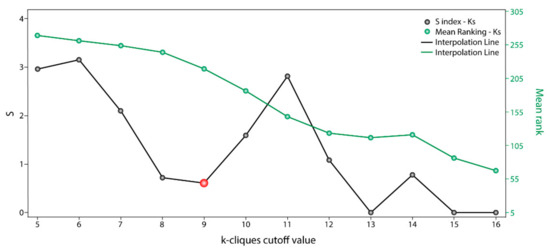In order to determine the best k-clique in the communality analysis, we used the index “S” [24,25]: , where and are the number of genes in each community and the number of communities for a defined k-clique cut-off value. If the distribution of genes across communities is close to a Gaussian distribution, or constant, will tend toward 0. Once k is defined in k-clique, a number of communities will be identified.