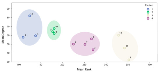 To be more selective about which communities would be most relevant within these 13, we used a clustering analysis. The K-means clustering analysis revealed four main community groups (Figure 3). Cluster 1 (Communities 4, 9 and 13) had the highest average values of , and , followed by Cluster 2 (Communities 5, 8 and 10) with regards to and . Therefore, these six communities were chosen for further analysis.