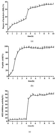 The degree of hydrolysis (DH) represents the extent of protein degradation, which has been widely used in hydrolysis efficiency assessments. As shown in Figure 1a, the DH of sesame protein showed an overall rising trend when simulating gastrointestinal digestion in vitro. In the stage of gastric digestion, sesame protein began to be hydrolyzed, and the DH ranged from 2.59% to 17.69% at 0–4 h. However, the DH increased suddenly when trypsin and α-chymotrypsin was added. In the stage of intestinal digestion, the DH increased slowly and tended to be stable due to the decrease of protein substrates and enzyme cutting sites in the digestive system. The DH eventually reached 36.70%. Figure 1b shows the changes of peptide yield at different time points during simulated gastrointestinal digestion. After adding pepsin, the peptide yield increased significantly ranging 95.46% with the increase of time. After being treated by trypsin and α-chymotrypsin, the peptide yield remained basically stable over a 6 h period. The changing rules of ACE inhibitory activity at different time points during simulated gastrointestinal digestion are shown in Figure 1c. Gastric digestive products of sesame protein exhibited weak ACE inhibitory activity without obvious upward or downward trend at 0–4 h, but intestinal digestive products had strong ACE inhibitory activity at 4–10 h and tended to be stable gradually. The ACE inhibitory activity reached 81.21% at 10 h. It was suggested that pepsin had less ability to hydrolyze sesame protein to produce polypeptide in simulated gastric digestion. There were more ACE inhibitory peptides generated from simulated intestinal digestion, which implied that trypsin and α-chymotrypsin offered the ability to achieve stronger ACE inhibitory peptides. It also would be supposed that the peptide sequences were buried deeper in the original protein structures from which they come or the sequences were embedded in the structured parts in which they were forced to be in the conformations that could not fit the active site of ACE. These results were also similar to that of other reports [20,21,22,23].